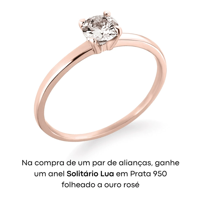 Na compra do par de alianças folheado a Ouro 18K amarelo ou rosé, você ganha de brinde um Anel Solitário Lua em Prata 950, também folheado a Ouro, na mesma cor de acabamento das alianças. Alguns pares de alianças oferecem opções de upgrade do brinde, ou seja, é possível trocar o modelo do brinde com um valor adicional. Consulte disponibilidade.