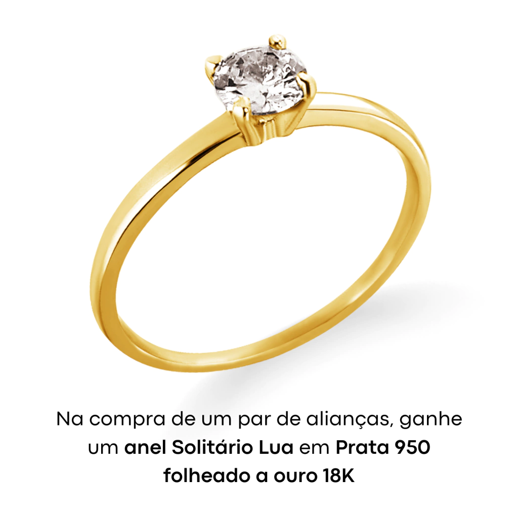 Na compra do par de alianças folheado a Ouro 18K amarelo ou rosé, você ganha de brinde um Anel Solitário Lua em Prata 950, também folheado a Ouro, na mesma cor de acabamento das alianças. Alguns pares de alianças oferecem opções de upgrade do brinde, ou seja, é possível trocar o modelo do brinde com um valor adicional. Consulte disponibilidade.