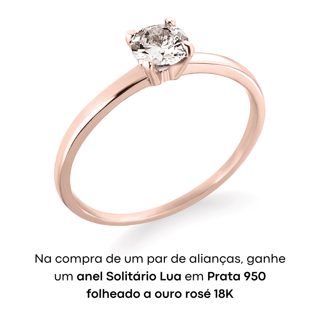 Na compra do par de alianças em Ouro 18K, você ganha de brinde um Anel Solitário Lua em Prata 950 folheado a Ouro amarelo ou rosé 18K (seguindo a mesma cor do metal das alianças). Alguns pares de alianças oferecem opções de upgrade do brinde, ou seja, é possível trocar o modelo do brinde com um valor adicional. Consulte disponibilidade.
